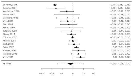 We included 17 studies in the analysis, containing 17,085 cases and 20,032 controls. Overall, mouthwash usage was 37.88% in the cases group and 47.06% in the control group. The risk difference between the cases and controls was minimal at −0.02 [−0.05, 0.01] and not statistically significant (Figure 2). The heterogeneity of the studies was high (I2 = 92.07%). Publication bias was not statistically significant (Z = −0.472, p = 0.637). Five studies contained distinct datasets for women. In this group, the risk difference was 0.06 [−0.03, 0.16], which was also not statistically significant. The heterogeneity of the studies was lower (I2 = 75.86%). Three studies contained distinct datasets for men. In this group, the risk difference was 0.00 [−0.07, 0.06]. The heterogeneity of the studies was lower (I2 = 64.12%).