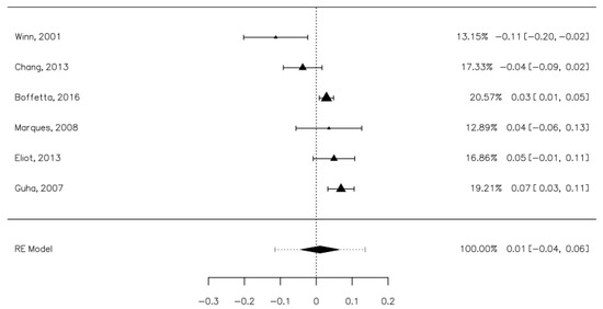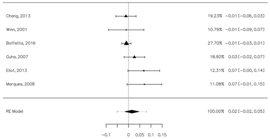 Six studies contained data that allowed us to establish the risk of oral cancers associated with mouthwash use [8,26,28,30,33,38]. These studies included 3833 oral cancer participants, of which 1475 were mouthwash users and 13,018 controls, of which 5194 were mouthwash users. The risk difference between the cases and control groups was minimal at 0.02 [−0.02, 0.05], a value which was not statistically significant (Figure 4). The heterogeneity of the studies was moderate (I2 = 59.35%). Publication bias was not statistically significant (Z = −1.344, p = 0.179).