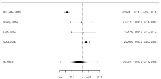 Four studies contained data that allowed us to establish the risk of laryngeal cancers associated with mouthwash use [8,26,28,30]. These studies included 2448 laryngeal cancer participants, of which 602 were mouthwash users, and 7984 controls, of which 2903 were mouthwash users. The risk difference between the cases and control groups was minimal, with a value of −0.03 [−0.11, 0.05], which was not statistically significant (Figure 6). The heterogeneity of the studies was average (I2 = 91.33%). Publication bias was not statistically significant (Z = 0.713, p = 0.476).