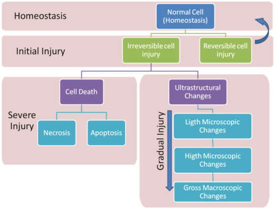 According to Kumar et al. [11], the continual execution of physical activities while the tissue is still inflamed hinders the interruption of the inflammatory cycle. This overload will promote inflammatory progression, leading the inflammation to a state of chronicity caused by structural and morphological changes (Figure 1), making cell damage irreversible.