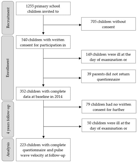 The flow diagram of the recruitment and enrollment process is shown in Figure 1. In brief, 1255 children were invited to take part in the study. In total, 540 children had written parental consent for study participation. Of these, 149 children were ill at the day of examination or relocated and 39 children did not return the parental questionnaire. Finally, 352 children had a complete baseline data set. Four years later, the same children were reexamined, and 223 (73%) children had complete parental questionnaire, including PWV measurement at the age of 10–12 years. Study participation from all schools and classes was achieved. The population characteristics are summarized in Table 1. The participants developed a significantly higher BMI (Δ 1.8 ± 1.6 kg/m2), BP (systolic: Δ 3.9 ± 8.2 mmHg, diastolic Δ 1.8 ± 7.6 mmHg), and cardiorespiratory fitness performance (1.9 ± 1.8 stages) after 4 years follow-up, which corresponds to an age-related normal development. The prevalence of overweight increased by 2% along with no changes in obesity from baseline to follow-up. Only one child was classified as severe underweight, and two children were classified as moderate underweight at baseline. Furthermore, a decreasing trend in elevated and high systolic (−7%) as well as diastolic BP (−5%) was observed from baseline to follow-up. The 10–12-year-old children had a mean PWV of 4.7 m/s (±0.3) on average. Regarding the development of household income over four years, 12.3% of the families had a higher income at follow-up and respectively, 4.9% of the families had a lower household income at follow-up.
