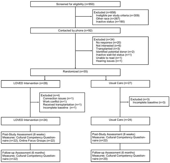 - Sieverdes, J.C.; Price, M.; Ruggiero, K.J.; Baliga, P.K.; Chavin, K.D.; Brunner-Jackson, B.; Treiber, F.A. Design and approach of the Living Organ Video Educated Donors (LOVED) program to promote living kidney donation in African Americans. Contemp. Clin. Trials 2017, 61, 55–62. [Google Scholar] [CrossRef] [PubMed]