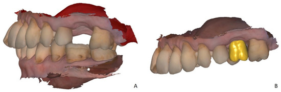 (A) The virtual model of the defect obtained with the intraoral scanner (Trios 4, 3Shape, Copenhagen, Denmark). (B) The virtual set-up of the pontic tooth in the CAD software (Dental CAD, Exocad, Darmstadt, Germany) with a 2 mm distance to the alveolar ridge.