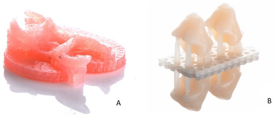 Both pontic tooth and denture base designs were exported in STL format. The tooth was prepared for printing in a nesting software (Netfabb Ver. 2019.2, Autodesk, Munich, Germany) and denture base in a slicing software (Simplify 3D Version 4.1, Simplify 3D, Cincinnati, Ohio, USA) to adjust the supporting structures and set the printing preferences. The denture base was printed with polyamide filament (Thermoplastic Denture Base Resin 3D Printing Filament, Valplast International Corp, NY, USA) using the FFF method (r.Pod, Arfona, NJ, USA) (Figure 3A). The melting temperature of the print head was 245 °C, and the printing table was heated to 40 °C. Afterwards, the pontic tooth was printed using the tooth-colored resin (Freeprint temp A3, Detax, Ettlingen, Germany) with a digital light processing (DLP) printer (D30II, Rapidshape, Heimsheim, Germany) (Figure 3B).