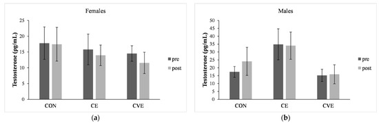- Wilkerson, J.E.; Horvath, S.M.; Gutin, B. Plasma testosterone during treadmill exercise. J. Appl. Physiol. 1980, 49, 249–253. [Google Scholar] [CrossRef] [PubMed]