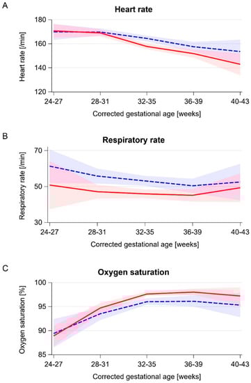 Baseline and post-therapy vital signs by corrected gestational age. Blue dashed line: mean baseline value, red solid line: mean post-therapy value, blue and red bands: corresponding 95% confidence intervals. (A) Heart rate. (B) Respiratory rate. (C) Oxygen saturation.