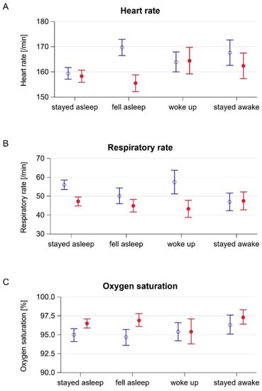 Baseline and post-therapy vital signs by states of wakefulness. Blue empty circle: mean baseline value, red filled circle: mean post-therapy value, blue and red error bars: corresponding 95% confidence intervals. (A) Heart rate. (B) Respiratory rate. (C) Oxygen saturation.