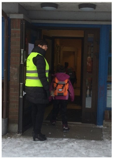 All the focus groups stated safety as a theme to ensure well-being at the school, and this was also a theme that emerged from the overall analysis. The parents stated that the lack of staff turnover created a safe environment for their children and that this contributed to both children and parent’s well-being. In addition, the school management’s philosophy of emphasizing a safe and inclusive environment also contributed to well-being. A tangible example of this philosophy put into action that was highlighted by parents was that each morning every single pupil was greeted by their name and welcomed to school by the principal (Figure 4).
