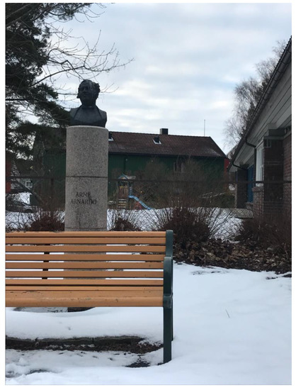 And this is a picture of the statue of Arnardo right outside the school. That’s kind of illustrative of this community. He came from here, from nowhere, and then became the king of Circus in Norway, and we are so proud of him. And there you see the bench where old people sit and chat. And there is the playground of the old kindergarten, and then there is the school (…) and the bushes by the statue are super exciting for the small children to play in … so all of this in a way represents how important the school is in this community, connecting everybody and making us feel that we belong together. After all, the node of our community is the school, it’s like a little nerve center.(Parent 4)