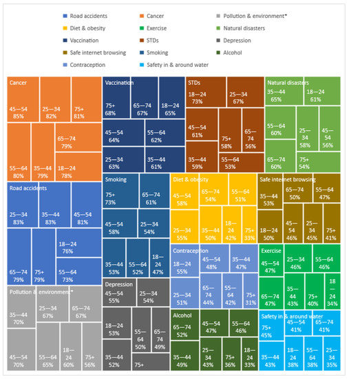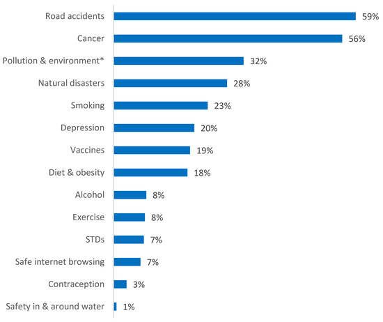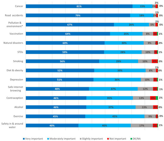 Regarding public health risks, cancer was considered very important by most participants (81%) followed by road accidents (79%), while air pollution and environmental protection were deemed very important by 67% of participants. Vaccination followed, with 64% of participants considering it very important, while natural disasters (such as earthquakes, flooding, etc.) were considered very important by 60% of the respondents. Other public health risks, including STDs, smoking, diet and obesity and depression, were considered very important by 51–59% of participants, while safe internet browsing, alcohol abuse, contraception, exercise and safety in and around water were deemed very important by 40–48% of participants (Figure 1).