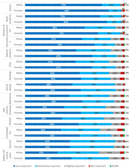Differences were observed between sexes regarding the importance of public health risks, with females being more concerned about the public health risks examined. Statistically significant differences were observed between sexes for the majority of public health risks, including cancer (84% of females vs. 77% of males, p = 0.002), road accidents (82% of females vs. 75% of males, p = 0.002), air pollution and environmental protection (73% females vs. 60% males, p < 0.001), vaccination (70% females vs. 57% males, p < 0.001), natural disasters (67% females vs. 51% males, p < 0.001), STDs (67% females vs. 51% males, p < 0.001), diet and obesity (56% females vs. 48% males, p = 0.001), depression (58% females vs. 44% males, p < 0.001), safe internet browsing (56% females vs. 39% males, p < 0.001), alcohol (54% females vs. 37% males, p < 0.001), contraception (55% females vs. 36% males, p < 0.001) and safety in and around water (46% females vs. 33% males, p < 0.001) (Figure 3, Table 2).