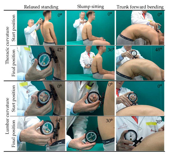 The sagittal thoracic and lumbar curvatures of the CAA were assessed in the relaxed standing position, slump sitting position, and maximum trunk forward flexion position according to the previously described procedure [27,40]. The SIM was determined by combining the sagittal spine morphotype in the three positions (Figure 1) mentioned above (relaxed standing, slump sitting, and maximum trunk forward flexion) [27,40]. Thoracic and lumbar curvatures were measured using an ISOMED Unilevel inclinometer (ISOMED, Inc, Portland, Oregon). Negative values represent the degree of posterior concavity or lordosis, and positive values represent anterior concavity or kyphosis [27].