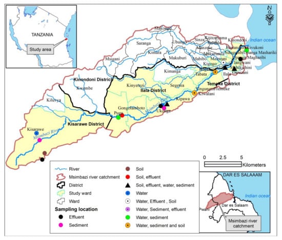 This study was conducted between February and March 2021 in the Msimbazi River basin in Tanzania. The river originates from the Kisarawe highlands in the Pwani Region and discharges its water into the Indian Ocean as previously described []. The Msimbazi River serves as an important drainage system for rainwater, runoff water and wastewater from community, medical, industrial and animal farming and agricultural activities along the basin.
