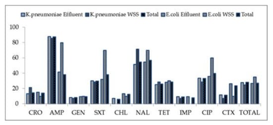 As shown in Figure 2, K. pneumoniae isolates were more resistant in effluent (27.9%) compared to the E. coli (26.6%) while the E. coli had a higher resistance in river water, sediment and crop soil than the K. pneumoniae (35 versus 25%), respectively. The K. pneumoniae isolates had higher resistance against nalidixic acid (54.6%) and ciprofloxacin (33.3%). The E. coli isolates were more resistant to ciprofloxacin (39.7%), ampicillin and trimethoprim/sulfamethoxazole (38%), respectively.