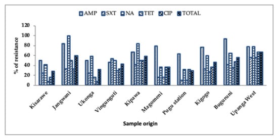 We found significantly lower levels of antibiotic resistance in Kisarawe and Pugu station, where the river originates, compared to the lower part of the basin (Jangwani and Upanga West areas), which discharges into the Indian Ocean. A possible explanation of these findings is that the basin is less contaminated at the upper part compared to the middle and lower basin due to anthropogenic activities and human settlement [,].