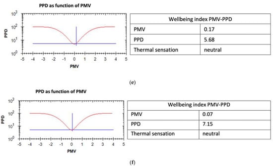PMV (presumed mean value) and PPD (presumed percentage of dissatisfied) as detected on: (a) 24.09.2016; (b) 29.09.2016; (c) 30.09.2016; (d) 06.10.2016; (e) 06.12.2016; (f) 07.12.2016.