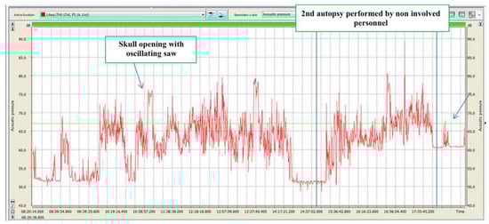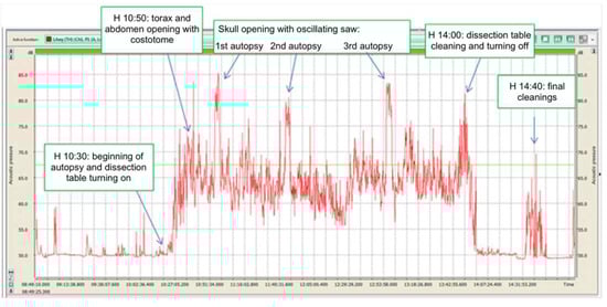 With regard to noise exposure, it should be specified that each dissection room operator participates in one or more autopsies daily, with each one extremely variable in duration. During autopsies, different noise-generating devices and instruments are generally used with different methods and durations. It was, therefore, impossible to identify homogeneous groups of exposed workers on which to carry out the exposure assessment based on time and specific job. Consequently, the measurements carried out relate to the contribution of dissection room activities to general noise exposure, as listed below (Table 3) (Figure 2, Figure 3, Figure 4 and Figure 5).