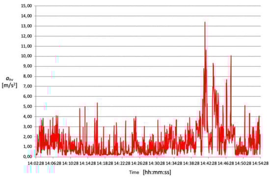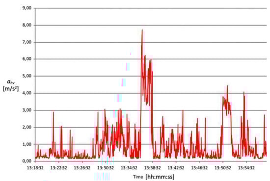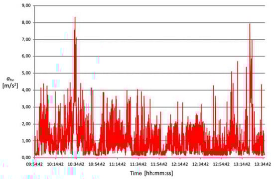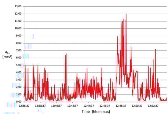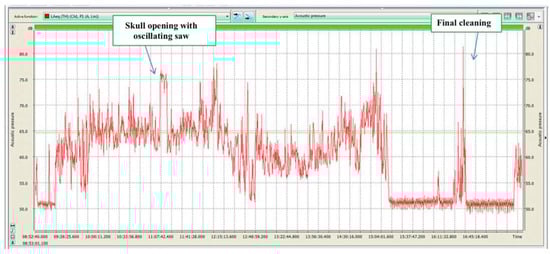 The acceleration mean square value (ahv) transmitted from the oscillating saw to the operator’s hand–arm system during the opening of the cranium theca is between approximately 4 and 5 m/s2 (Figure 6, Figure 7, Figure 8 and Figure 9).