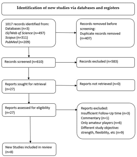 In the literature search, we found 497 articles from ISI/Web of Science, 311 from Scopus and 209 from PubMed/MEDLINE, for a total of 1017 articles. After removing 407 duplicates, 610 articles were included. In total, 206 titles were excluded. Of the 404 remaining abstracts, 27 full texts were included for review. Only 8 of these met the inclusion criteria and were analysed in the review (Figure 1) for a total of 3665 athletes, divided into 3458 males and 197 females. The eight studies consisted of five randomised clinical trials, two cohort studies and one case series. The randomised clinical trials were assigned a level of evidence I in Table 1. The cohort studies were assigned a level of evidence III, and the case series were assigned a level of evidence IV.