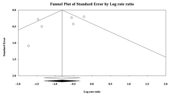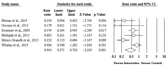 Using the software “Comprehensive Meta-Analysis Version 3.3.070”53, a meta-analysis of the effectiveness of the prevention measures was carried out. We included six articles out of the eight in our review in the analysis, i.e., those in which it was possible to calculate the IRR. The forest plot in Figure 2 visually depicts the effectiveness of the interventions studied. The IRR of the effect size was 0.443 with p-value = 0.001. Figure 3 shows the funnel plot, where the natural logarithm of the Rate Ratio is depicted on the x-axis and the standard error of the studies is depicted on the y-axis. No element of heterogeneity among the samples analysed in the meta-analysis was identified.