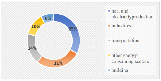 In water–energy nexus analysis, advanced water and energy planning, as well as a better understanding of possible future policies and technologies, are coupled with knowledge of better educated water and energy planning. This is expected to assist public policymakers and energy and water resource managers in conservation and sustainability [2]. A strain is placed on three essential resources when the population increases: water, energy, and food (WEF). The United Nations predicts that the global population will reach 10 billion by the year 2100, with a majority of this increase taking place in urban areas [3]. As of 2030, 60% of the world’s population will reside in urban areas. Due to the growth in the population, urbanization, and industrialization, the demand for water is increasing and also causes stress on water supply and quality, particularly in regions where water stress already exists, such as the Asia, Central America, and Middle East North Africa (MENA) regions [4]. Climate change has an influence on water–energy–food resource availability by affecting agriculture output, water supply, and cooling and heating demand [5]. Climate change will certainly decrease rainfall, limiting access to surface water and further diminishing stored soil moisture in subtropical areas, which already have the fastest population increase and the biggest demand on water–energy–food resources [6]. A global warming scenario is likely to intensify competition and trade-offs in the three resources (food, water, and energy) that are under increasing demand [7,8]. Water and energy consumption will rise across all industries as a result of the global temperature rise caused by climate change [9]. Figure 1 illustrates the major inflows within and between water, energy, and food systems. These aspects should preferably be grouped using standard categories to facilitate the compilation of quantitative records that are consistent, rational, and comparable across time and nations. Furthermore, the more frequent and severe weather events cause a greater the threat to agriculture. Furthermore, there is evidence that climate change is having an impact on the energy industry by driving the adoption of renewable energy supply alternatives that reduce greenhouse gas emissions, leading to an increase in the use of biofuels [10]. Major contributors to greenhouse gas are shown in Figure 2: Industries and electricity production are the main sources of greenhouse gas, contributing 21% and 25%, respectively and transportation is the third source of pollution, contributing 14%. Meanwhile, buildings and other sources contribute 16% to hazardous emissions. However, climate change adaptation calls for more efficient energy, water, and food usage to combat these risks.