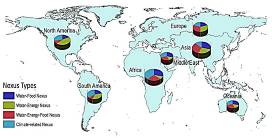 Four types of nexuses are shown in Figure 5 and Figure 6 shows the graphical representation of water–energy–food nexus. America is more concerned about water–energy nexus while Europe and Asia deal with water-energy–food nexus, further Africa is more concerned with climate related nexus. The Middle East and Oceania share equal portions in all nexus types.