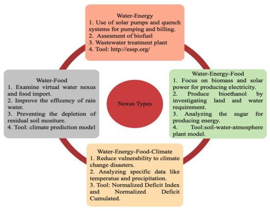 A large number of climate-related actions have been carried out in order to lessen long-term susceptibility to catastrophe and environmental degradation caused by climate change. Several climate-related nexus projects employed a variety of approaches, such as examining specific data, including the precipitation and temperature in Mexico, utilizing meteorological and historical data to underpin the climate change and poverty nexus in Nigeria, and emphasizing energy use and greenhouse gas emissions in water management. Additionally, climate change nexus was also investigated in cities. To resolve a major water scarcity in the Australian National Electricity Market in 2007, a system dynamics technique was employed. Resilience and sustainability were improved through the use of hybrid energy solutions such as the transformation of municipal governance systems [27].
