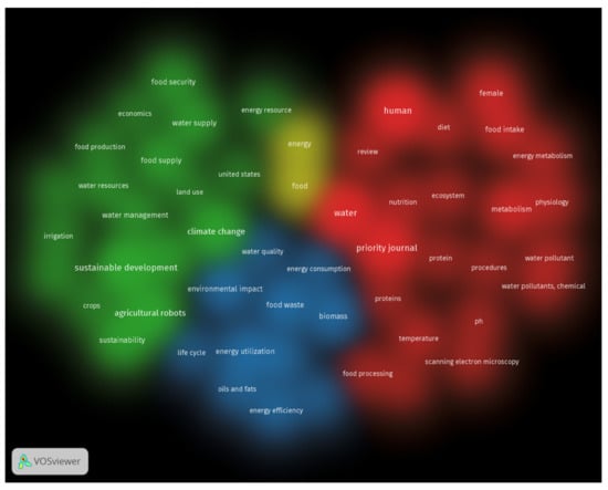 Density visualization of keywords. Green: sustainable development and water management; red: water and food intake; yellow: water and food; blue: environmental impact.