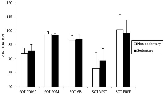 No differences were found between sedentary and non-sedentary participants for the variables related to postural control (Figure 1). A tendency was only found for the SOT-CES (SOT-COMP in Figure 1) component (p = 0.061), with greater values for the sedentary participants.