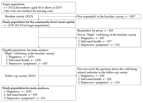 Study population. * Depressive symptoms were assessed for those aged 65 or above.
