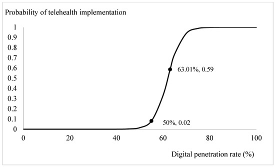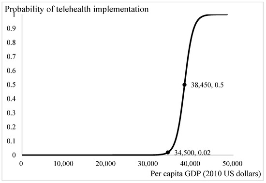 Figure 4 presents the influence of income status on the demand for telehealth. The threshold of per capita GDP for demand of telehealth is 34,500 US dollars. When per capita GDP exceeds 45,500 US dollars, there is a definite demand for telehealth among the population. With the current income of 38,450 US dollars per year, the probability of introducing a telehealth system into the community is 0.5. Increases in per capita GDP leads to increases in the affordability of telehealth services. Health services are luxury goods [42]. The poorer the population is, the lesser luxury goods are demanded.