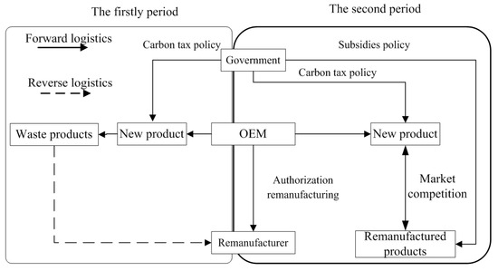Two periods are considered in this study. In the first period, there are only new products in the market, and the decision variable is the retail price of the new product per unit. In the second period, under the protection of intellectual property rights, the OEM authorizes a remanufacturer to produce the former’s products. As a premise, authorization fees are charged by the OEM on the remanufacturer. The decision variable in the period is the amount of the authorization fee and the retail price of the new product per unit. Moreover, before remanufacturing in the second period, the remanufacturer is responsible for collecting the end-of-life (EOL) products manufactured in the first period [51]; the decision variable here is the collection rate of the EOL products. To promote the development of remanufacturing, the government either subsidizes the remanufactured products or imposes carbon taxes on new products in both periods. Figure 1 depicts the two-period decision model.