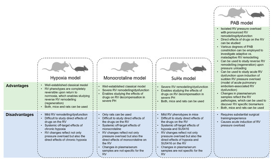 PAB in mice and rats is the most reliable model of RV hypertrophy and failure, and has several advantages over other animal models (Figure 1). For example, mouse PAB model allow to discover RV-specific drug targets by exploiting gene-specific loss-of-function or gain-of-function mice in specific cell types at specific time points, as well as to test the effect of potential pharmacological agents on RV function and structure in an easy, fast, cost-effective, and reproducible manner. In addition, using the same strain of animals helps to exclude heterogeneity of the results due to genetic variations. This allows for experimental designs to evaluate specific molecular mechanisms in smaller animal numbers. It is essential to recognize that, in the PAB model, the degree of long-term RV remodeling and RV failure is directly proportional to the initial degree of PAB [19]. Therefore, it is necessary to keep equivalence of PA ligation size between groups when comparing subsequent remodeling responses in different groups of animals. Importantly, small animal PAB models can be used also to test potential cardiotoxic effects of the drugs developed for other diseases as well as in PH before moving forward to clinic trials [20]. It was shown in isolated perfused rat hearts that bosentan decreased RV contractility in a dose-dependent manner in the hypertrophied RV but not in the normal RV [21]. Earlier studies demonstrated that PAB rats display compensated RV hypertrophy without signs of RV failure compared to SuHx or MCT-challenged rats, which led authors to conclude that the PAB model cannot fully recapitulate human RV failure observed in PAH patients [22]. However, the RV phenotypes observed in PAB models are causally related to the degree of pressure overload, as tighter PAB constriction leads to decompensated RV failure with high mortality [19]. Interestingly, a recent study has demonstrated that the rat PAB model develops all hemodynamic and histological features of RV failure to a similar degree as found in MCT and SuHx rats [23].