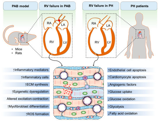The pulmonary artery banding (PAB) model of right ventricular (RV) failure recapitulates many features of RV failure observed in pulmonary hypertension (PH) patients. PAB in mice and rats causes RV dilatation and RV wall hypertrophy similar to those observed in PH patients. Many of the pathological characteristics of RV remodeling in PH patients can be seen in the RV of PAB rodents, including increased myocardial inflammation, upregulation of inflammatory mediators, accumulation of extracellular matrix (ECM), myofibroblast differentiation, alterations of epigenetic processes, dysregulation of cardiomyocyte excitation–contraction coupling, oxidative stress, apoptosis of cardiomyocytes and endothelial cells, downregulation of proangiogenic factors, increased glucose uptake and glycolysis, and decreased glucose and fatty acid oxidation.