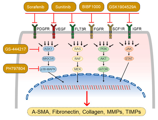 Mechanisms of agents identified to attenuate myocardial fibrosis in pulmonary artery banding (PAB)-induced right ventricular (RV) remodeling. BIBF1000, a nintedanib analogue that targets VEGFRs, PDGFRs, and FGFRs, GSK1904529A, a specific IGF-1R inhibitor, sorafenib, a multi-kinase inhibitor of PDGFRs, VEGFRs, Flt3, c-Kit, c-RAF, and b-RAF, and sunitinib, an inhibitor of PDGFRs, VEGFRs, Flt3, KIT, CSF1R, and RET have been shown to attenuate myocardial fibrosis by inhibiting the activity of cardiac fibroblasts and attenuating the expression of profibrotic genes such as α-SMA (actin alpha 2), fibronectin, collagen, MMPs (matrix metalloproteinases), and TIMPs (tissue inhibitors of metalloproteinases), thus improving RV function in animal models of PAB.