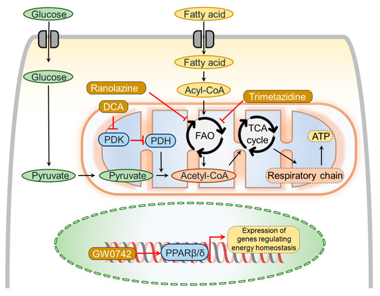 Mechanisms of agents improving metabolic alterations in pulmonary artery banding (PAB)-induced right ventricular (RV) remodeling. Dichloroacetate (DCA) inhibits pyruvate dehydrogenase kinase (PDK), resulting in activation of pyruvate dehydrogenase (PDH), which allows pyruvate to enter the TCA cycle and promote glucose oxidation. While trimetazidine and ranolazine inhibit fatty acid oxidation (FAO), resulting in activation of glucose oxidation, GW0742 activates PPARβ/δ, which mediates the expression of genes regulating metabolic homeostasis. Cumulatively, these agents showed beneficial effects on the RV by improving metabolic changes.