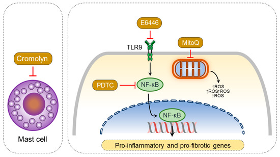 Mechanisms of agents attenuating myocardial inflammation and oxidative stress in pulmonary artery banding (PAB)-induced right ventricular (RV) remodeling. E6446, an inhibitor of TLR9, and pyrrolidine dithiocarbamate (PDTC), an inhibitor of NF-κB, attenuate inflammatory cell activation and expression of proinflammatory genes. Cromolyn, a mast cell stabilizer, inhibits mast cell degranulation and prevents the release of proinflammatory mediators. MitoQ inhibits mitochondria-derived ROS production and oxidative stress. In summary, these agents inhibit myocardial inflammation and oxidative stress and thereby improve RV function and adaptation to pressure overload.