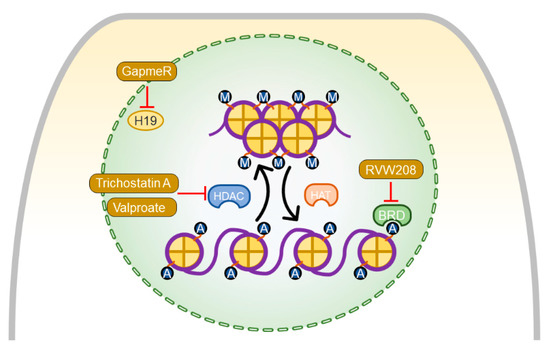 Mechanisms of agents improving epigenetic alterations in pulmonary artery banding (PAB)-induced right ventricular (RV) remodeling. Trichostatin A and valproate target histone deacetylases (HDACs), which remove acetyl groups from lysine residues of histone proteins. RVW208 is an inhibitor of bromodomain-containing protein 4 (BRD4), which is an epigenetic reader that recognizes histone proteins and acts as a transcriptional regulator of various genes. GapmeR, a site-specific antisense oligonucleotide, suppresses the expression of long noncoding RNA H19. All these agents mediate the improvement of RV function and promote its adaptation to pressure overload.