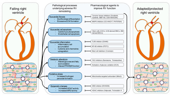 Despite extensive research, the cellular signaling pathways underlying the development of RV hypertrophy and its transition to RV failure are not fully understood. The pathobiology of RV remodeling is characterized by development and progression of several pathological processes, including augmented myocardial fibrosis [24], inflammation [25], impaired myocardial capillarization [26], dysregulated neurohormonal homeostasis [27], altered metabolism [28], mitochondrial dysfunction [29], and increased production of reactive oxygen species (ROS) [30]. However, cellular mechanisms that regulate and govern such processes in pressure overload-induced RV remodeling remain incompletely understood. Nevertheless, recent studies have identified several dysregulated signaling pathways that drive such pathological processes in RV remodeling in response to pressure overload. Each pathological process has been shown to be regulated by distinct signaling pathways. For example, tyrosine kinase and mitogen-activated protein kinase (MAPK) signaling pathways have been shown to contribute to cardiac fibroblast transdifferentiation and extracellular matrix (ECM) synthesis resulting in adverse myocardial fibrosis [31], while cardiomyocyte loss and capillary rarefaction were results of augmented activation of apoptotic signaling pathways. Myocardial inflammation was associated with toll-like receptor 9 (TLR9)–nuclear factor kappa-light-chain-enhancer of activated B cells (NF-kB) signaling pathway activation in myocardial macrophages [32]. Similarly, activation of mast cells, which release a plethora of inflammatory mediators, has also been shown to worsen RV remodeling [32]. In addition, increased oxidative stress was also found to contribute to adverse RV remodeling in response to pressure overload [33]. Similarly, metabolic alterations such as altered glucose and fatty acid oxidation (FAO) were also demonstrated to contribute to the development of RV failure [34]. Finally, epigenetic alterations such as increased histone deacetylase (HDAC) and bromodomain (BRD) activities were also found to contribute to RV functional decline [35]. Taken together, all these pathways have emerged as promising targets to protect the pressure-overloaded RV in animal models of PH.