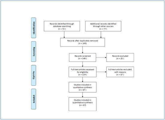 According to the PRISMA-Statement (prisma-statement.org) all records were screened and excluded in case abstracts clearly indicated non-eligibility, e.g., when only specific symptoms of poisonings or animals were studied. Full-text-analysis was carried out on all other records. Studies were considered eligible when addressing active ingredients in pesticides or groups of active ingredients (e.g., organophosphates). Case-studies and papers which do not report or not allow to calculate a case fatality were excluded. The search was supplemented by inspecting bibliographic reference lists in all identified papers. Articles initially not identified by the automatic search were then manually back searched. Finally, 149 papers were identified of which 67 could be included after assessment. We excluded 25 papers by abstract and 57 by full-text analysis mainly because no information on active ingredients or group of pesticides was presented (Figure 1).