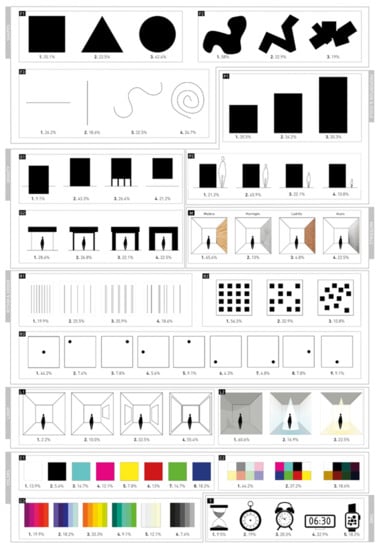 Compositional Preferences for Ideal Spaces Scale (CPIS). This self-report was designed by the researchers specifically for the purposes of the present study. It is composed of a series of 17 groups of shapes and images that represent different concepts and compositional elements grouped into the following categories: (1) shapes, (2) proportion and scale, (3) gravity, (4) materials, (5) rhythm and order, (6) lighting, (7) color, and (8) time (as related to a historical period and its aesthetic style). The respondent indicates which figure in each category is preferred for an ideal domestic space in which to live and develop as a person. Each figure-variant is assigned a number which indicates the preferred compositional characteristic (see Table 2 and Figure 1). Due to the features of this survey-based tool, psychometric properties were not explored.