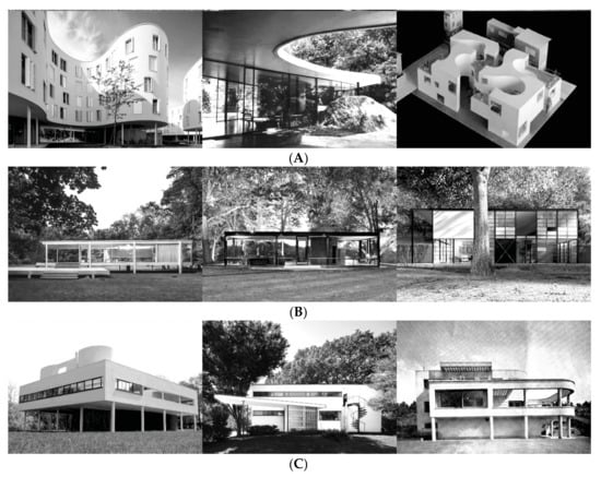 Panel (A): (From right to left) Apartments on Ave. Maréchal Fayolle, SANAA (2018); Das Canoas House, Oscar Niemeyer (1951); Okurayama Apartments, SANAA (2008). Panel (B): (From right to left) Farnsworth House, Ludwing Mies Van der Rohe (1946); The Glass House, Philip Johnson (1949); The Eames House, Charles and Ray Eames (1949). Panel (C): (From right to left) Villa Savoye, Le Corbusier and Pierre Jeanneret (1929); The Gropius House, Walter Gropius (1988); Villa Jaritz, József Fischer (1942).