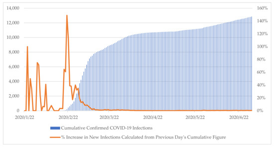 Figure 2. Furthermore, the government dismantled institutions specifically set up to address the spike by the data cutoff date. Government briefings continue beyond the cutoff date. However, for the purpose of the study, the analysis is restricted to the early half of 2020. The contagion was contained as demonstrated by the percentage increase in new cases. 1 July 2020’s new case number accounts for only 0.39% of the cumulative total number of cases. The corresponding 5-day average of the same figure is 0.39%. This percentage increase figure shares the underlying logic resembling the Basic Reproduction Number (R0) used in epidemiology to depict the innate infectiousness of the disease [
