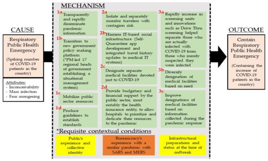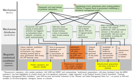 Figure 4. Specifying the requisite contextual conditions is necessary as possession of a response mechanism blueprint does not necessarily translate to its manifestation and effective operation. In South Korea’s case study, it can be largely reduced to (1) public’s experience and collective identity, (2) bureaucracy’s experience with a similar pandemic with SARS and MERS, and (3) infrastructural preparations and status at the time of the outbreak. South Korea is a largely homogeneous society with a common historical experience, which is an experience that is geographically confined being located on a peninsula and with a common history proliferate with national solidarity eliciting events. This condition defines the citizen response and the social norm to the mechanism.