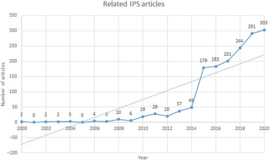 In the context of ageing populations, there is a special need for indoor location solutions in multiple scenarios. For example, detecting the location of a resident in a nursing home at all times while checking what inhabitants are doing and whether anything unusual is happening. In response to this demand, monitoring systems based on the Internet of Things (IoT) have emerged. These spaces are also referred to as smart homes and are composed of smart devices that are often unobtrusive in ambient-assisted living contexts []. This fact has attracted the attention of numerous researchers over the last two decades. This is demonstrated by the fact that when filtering by “Indoor Location System” and “Positioning Location System” in the Scopus platform, approximately 1500 papers are retrieved. The increasing trend in the number of papers related to this topic between 2000 and 2020 is illustrated in Figure 1.