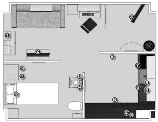 Location of Estimote Sticker beacons in the UJAmI Smart Lab. (1) TV controller, (2) Book, (3) Entrance door, (4) Medicine box, (5) Food cupboard, (6) Fridge, (7) Pot drawer, (8) Water bottle, (9) Garbage, (10) Wardrobe door, (11) Pyjamas drawer, (12) Bed, (13) Bathroom tap, (14) Toothbrush, (15) Laundry basket.