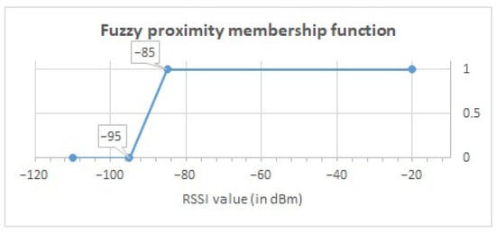 - Fuzzy Value represents the fuzzy RSSI value obtained from the fuzzy proximity membership function proposed in Figure 3.