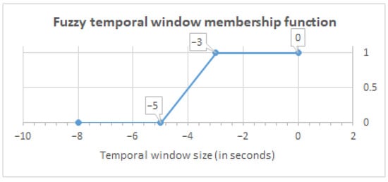 To calculate the fuzzy value, we rely on the RSSI value read from the beacon. We use the fuzzy membership function illustrated in Figure 3 to obtain a proximity term between 0 and 1, giving more importance to RSSI values closer to the inhabitant, and reducing more distant RSSI values in order to distinguish the location of the inhabitant in the smart lab more clearly. Based on this fuzzy value, we calculate the proximity membership degrees considering its fuzzy temporal window defined in Figure 4. This temporal window gives preference to fuzzy values closer in time. This processing is described in Equation (1).