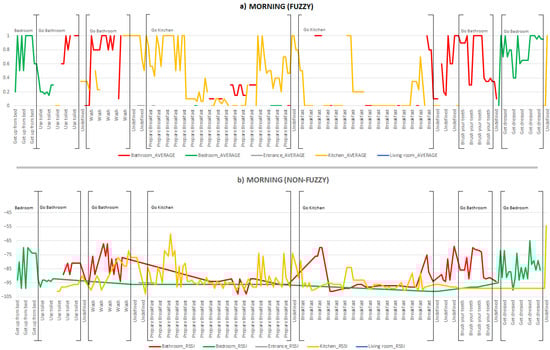 Figure 5 graphically represents the activities performed by the inhabitant in the morning, as well as the areas visited while performing them. The first of the morning activities carried out by the inhabitant is Get up from bed. During this activity, the inhabitant is in the bedroom area of the smart lab (green line). There is no significant difference in identifying the location of the inhabitant during this activity without applying fuzzy processing. Next, he/she performs the activity Use toilet. During this activity, we can observe in Figure 5a that the inhabitant goes to the bathroom area (red line) from the bedroom where he/she previously was in the smart lab (green line). In addition, there is a gap in the inhabitant’s path because in a short interval of time, weaker broadcasting signals are received from the kitchen beacons than from the bathroom. This is due to fluctuation in the broadcasting signals emitted by the beacons as well as in the frequency of emission. In Figure 5b, there is no gap, but it is more difficult to discern in which area the inhabitant is located, as similar values can be seen for different areas.