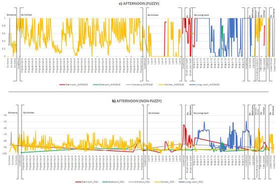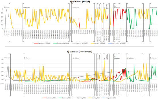 In this subsection, we compare the results obtained with the methodology using fuzzy processing versus non-fuzzy processing. To do so, a full day’s dataset is used, i.e., for the activities performed by the inhabitant in the morning, afternoon and evening.